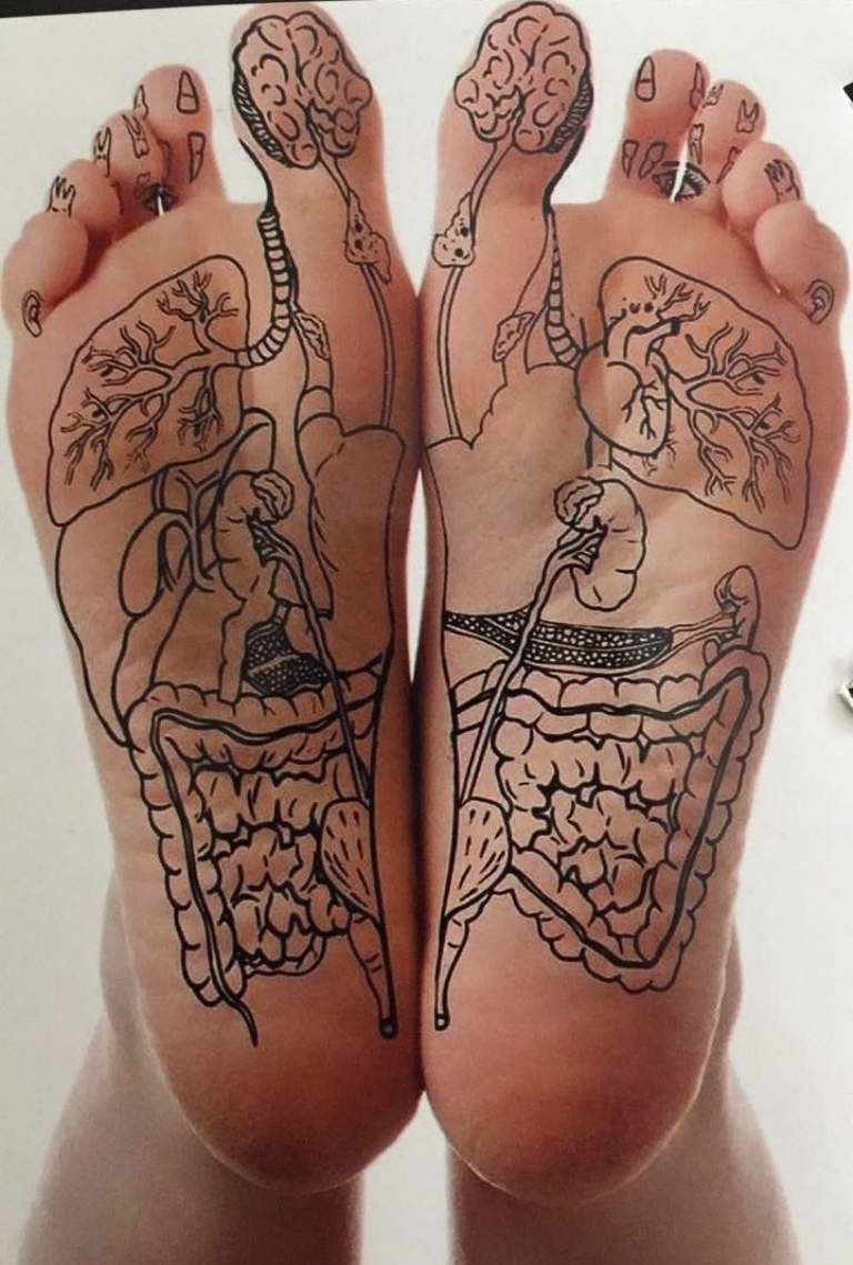 El cuerpo entero está reflejado como mapas en las manos, la vagina, las orejas, los ojos (iridiología), y los pies. Hacer masajes en los pies y las manos es tan saludable porque toca todas las terminales de nuestros órganos y vísceras, es la reflexología.