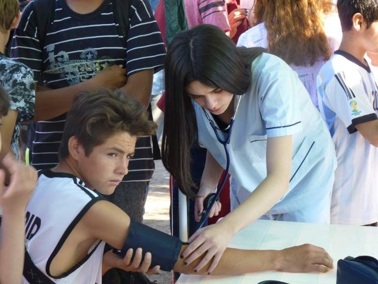 Las actividades comenzaron a las 9,30 en la sede del Club La Merced. Los estudiantes del Instituto IDEA prepararon en su gazebo mesas en las que instalaron tensiómetros, balanzas y demás instrumental para brindar un servicio de chequeo médico básico a todos los asistentes. Mientras las demás instituciones se iban acomodando, los primeros vecinos en llegar, tanto grandes como chicos, comenzaron a desfilar por el puesto de los futuros enfermeros para conocer su nivel de presión, índice de masa corporal, etc.