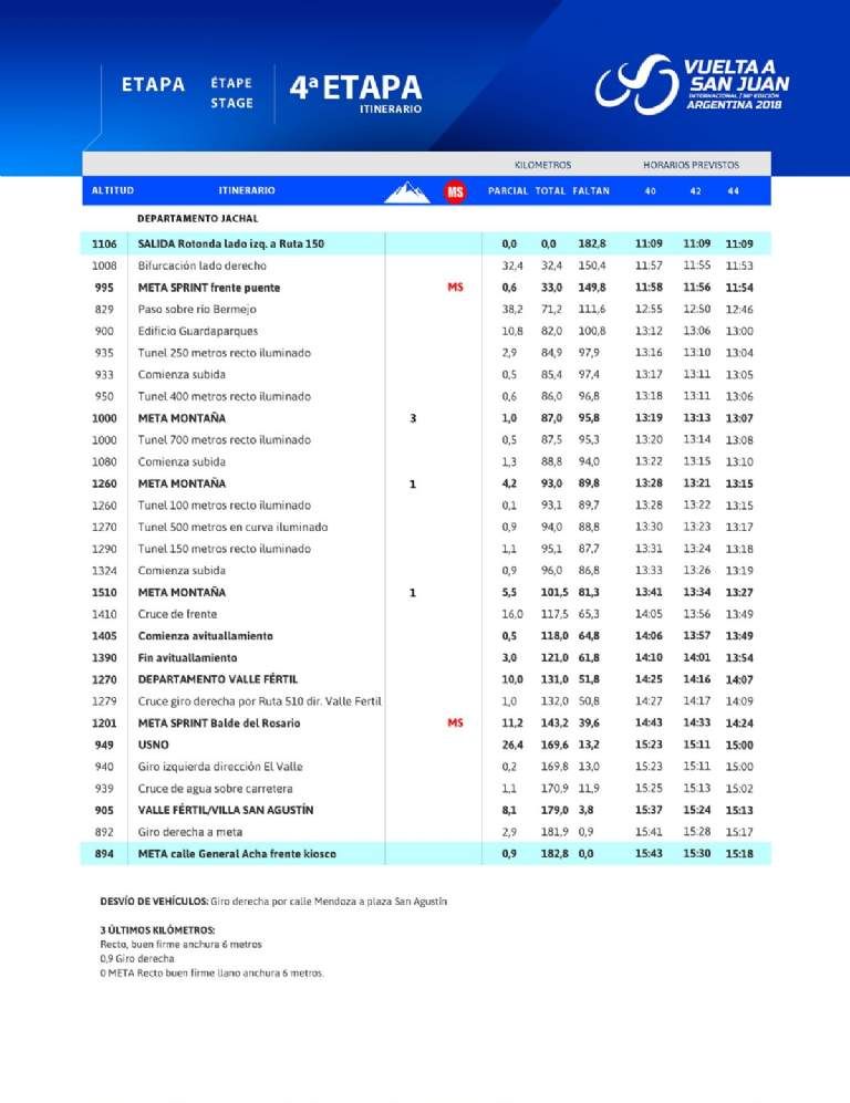 Al menos una hora será postergado el inicio de la 4ta etapa de la Vuelta a San Juan que incluye Jáchal y Valle Fértil. “El lanzamiento estaba previsto a las 10,30 pero será a las 12 horas por las demoras en la ruta debido a que todos los badenes están con arrastre por las lluvias de anoche”, contó Hermes Rodríguez, uno de los organizadores de la carrea de ciclismo, la más importante de San Juan.