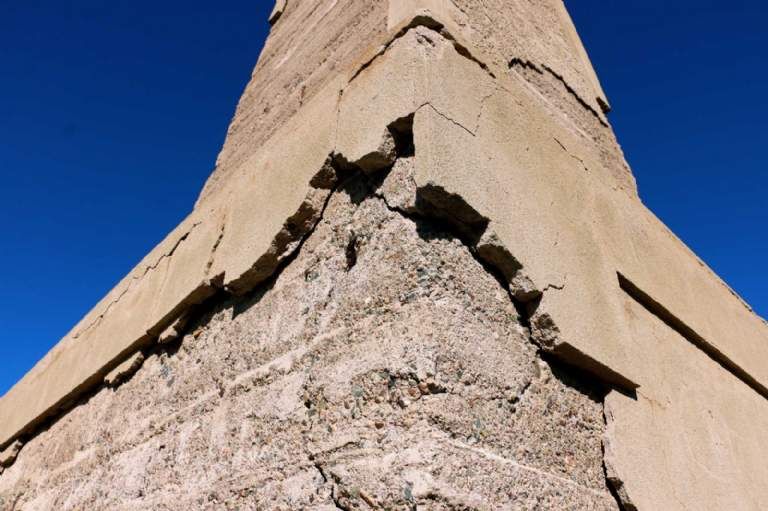 Hoy es un monumento al abandono. En la base de hormigón ya asoman las vigas de hierro oxidadas y en toda esa base, de unos 2 por 2 metros, no existe el grueso revoque de más de 5 centímetros que la recubría. Obviamente las primeras en desaparecer fueron las placas de bronce, por su valor. Lo que no se entiende es la destrucción del cemento que recubría el monolito piramidal de cuatro caras y casi 14 metros de altura. Con ese revoque se perdieron todas las inscripciones.