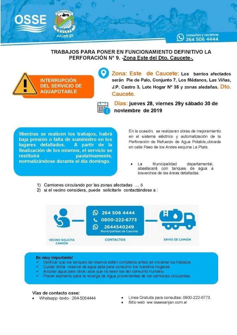El departamento de prensa de Obras Sanitarias (OSSE) comunicó que este viernes 29 y sábado 30 de noviembre, varios barrios de Caucete se verán afectados en el servicio de agua potable. Es por eso que pide a todos los vecinos de los barrios: Pie de Palo, Conjunto 7, Los Médanos, Las Viñas, J.P. Castro 3, Lote Hogar N° 35 y zonas aledañas; tomen las medidas correspondientes ante esta situación.
