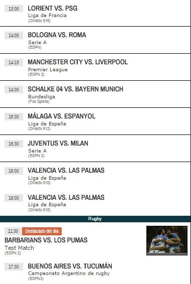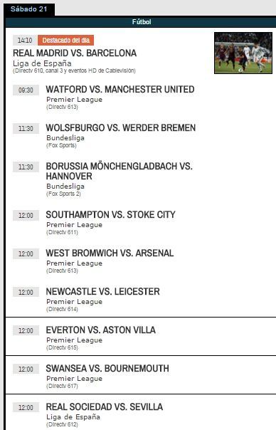 Tras un fin de semana con eliminatorias rumbo a Rusia 2018 y la clasificación de los equipos del viejo continente a la Eurocopa 2016, vuelve el fútbol en Europa. Lo más destacado será el clásico entre Real Madrid y Barcelona, que jugarán a las 14.10 con transmisión de Directv (canal 610 y HD) y Cablevisión (en el canal 3 y eventos HD).