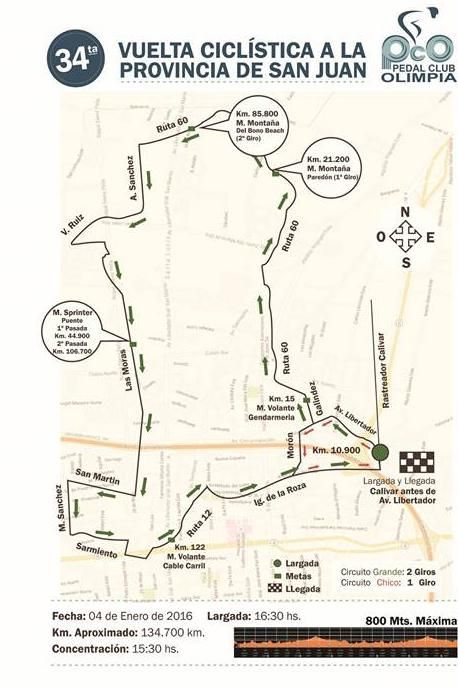 La carrera comienza a las 16:30 en Rastreador Calívar antes de Av. Libertador, lugar de llegada también. El recorrido está compuesto por dos circuitos: uno grande, que visita el paredón del dique de Ullum, Del Bono Beach y calle Las Moras, para el lado de Zonda; y el chico que comprende las calles Morón, Av. Libertador, Calívar e Ignacio de la Roza.