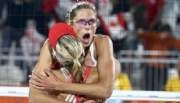 Sarah Pavan y Heather Bansley de Canada celebran durante el partido ante Suiza. Foto: Reuters / Ruben Sprich