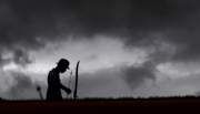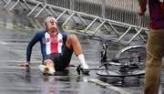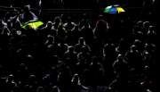 Fans bajo la lluvia miran un partido de beach voley de damas en la playa de Copacabana en Río de Janeiro.