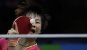 Ding Ning de China prepara su servicio ante Kim Song I de Corea del Norte en la semifinal de tenis de mesa. Foto: AP / Petros Giannakouris