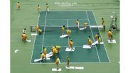 Voluntarios usan toallas para secar la cancha central durante la lluvia en el Centro Olímpico de Tenis.