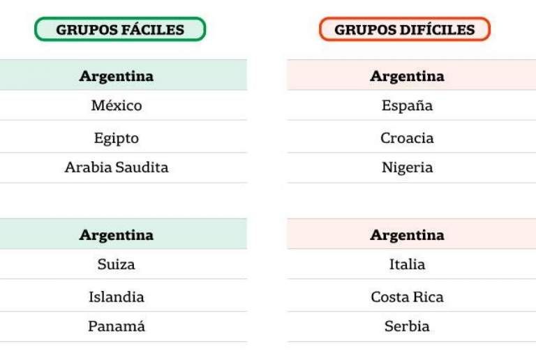 En este panorama, la selección argentina puede caer en un grupo de los denominados "accesibles", como "México-Egipto-Arabia Saudita" o "Suiza-Islandia-Panamá". Pero también (que es lo más posible) podría terminar en algún grupo de la muerte, como "España-Croacia-Nigeria" o "Italia-Costa Rica-Serbia".