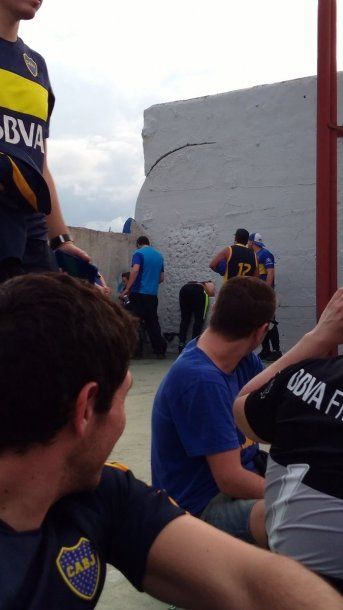 El protagonista fue un hincha xeneize que quiso pasarse de la tercera bandeja Sur (la que solían utilizar los visitantes antes de la prohibición) hacia la platea contigua y quedó atrapado en un hueco de la pared.
