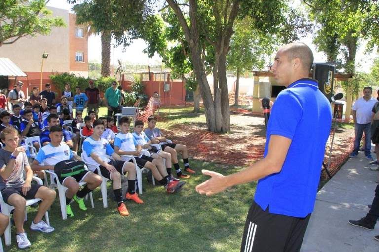 El campeón Mundial 1998 con Francia, les dio una charla inicial a los chicos de Trinidad, Unión, Alianza y Atenas de Pocito, que en un número cercano a la centena, se reunieron para disfrutar la voz de la experiencia del ex Platense y River en nuestro país.