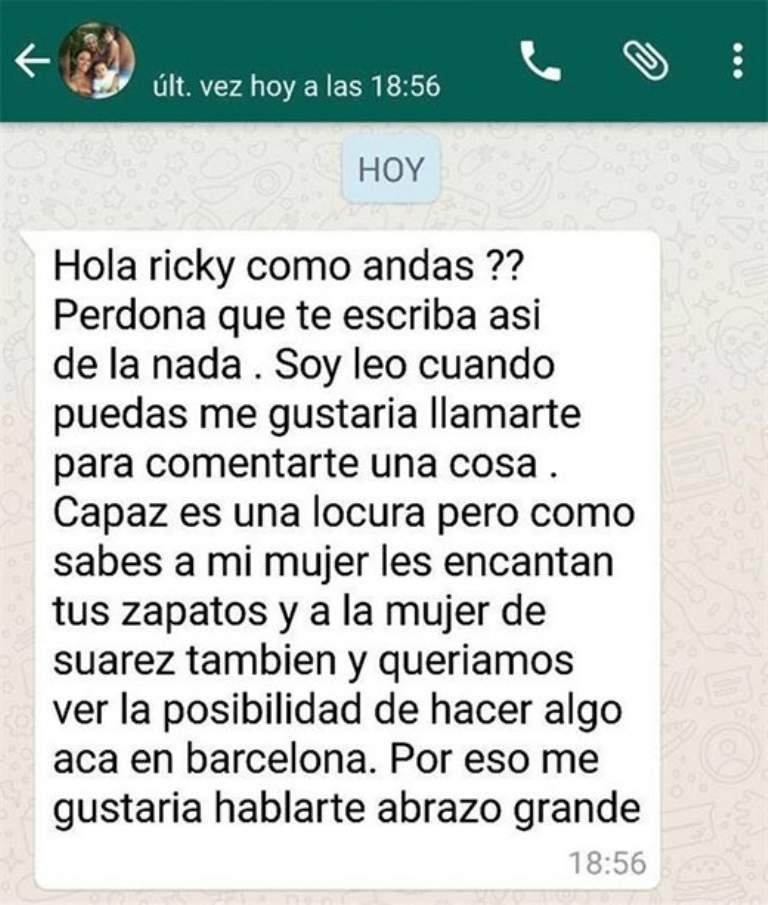 "Hola Ricky, ¿Cómo andás? Perdoná que te escriba así de la nada. Soy Leo. Cuando puedas me gustaría llamarte para comentarte una cosa. Capaz es una locura, pero cómo sabés a mi mujer le encantan tus zapatos y a la mujer de Suárez, también. Queríamos ver la posibilidad de hacer algo acá en Barcelona. Por eso me gustaría hablarte. Abrazo grande", reza el mensaje que se viralizó en las últimas horas.