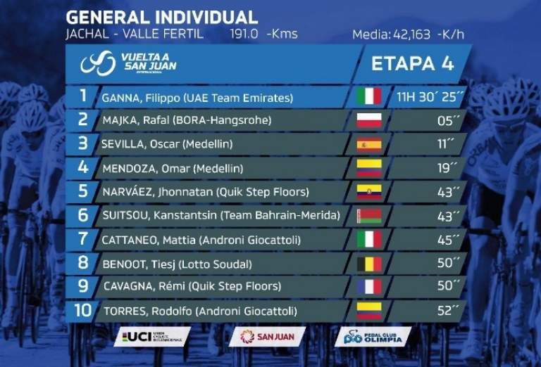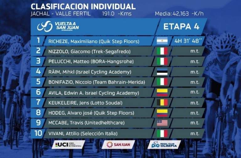 Maxi 'Atómico' Richeze, ciclista del Qucik Step, se quedó con la victoria de la 4ª etapa de la Vuelta a San Juan, que unió las ciudades de San José de Jáchal con San Agustín de Valle Fértil a través de la imponente ruta 150.