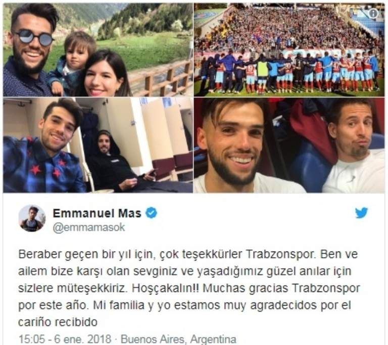 El sanjuanino Emmanuel Más, flamante incorporación del Boca de Guillermo Barros Schelotto, aprovechí el Día de Reyes para enviar un afectuoso saludo a los hinchas y miembros del Trabzonspor turco, conjunto que le dio la oportunidad de cruzar el Charco dentro de su carrera profesional.
