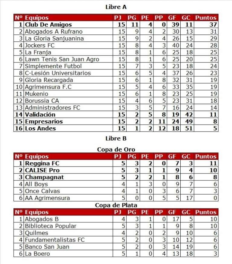 En Libre A, Club de Amigos cumplió con la última jornada empatando 3-3 Agrimensura FC; ya que se adjudicó la copa la fecha pasada. Además, Validación, Empresarios y Los Andes perdieron la categoría. En Libre B, Reggina RC gritó campeón al ganarle 1-0 a CALISE con un gol polémico por la vía del penal. También, Champagnat acompañará a los dos equipos que disputarán Libre A la próxima temporada.