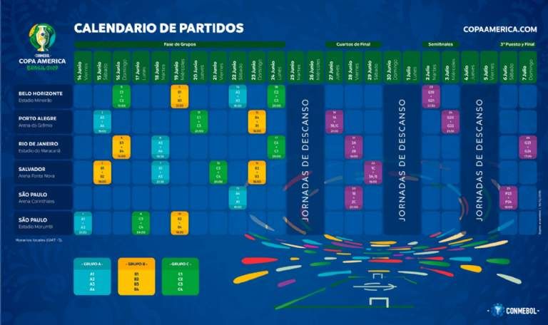 La Copa América de Brasil tendrá un total de seis sedes que, además del Morumbí, escenario del partido inaugural, y del Maracaná, de la final, serán: Mineirao, de Belo Horizonte; Arena do Gremio, de Porto Alegre; Arena Fonte Nova, de Salvador de Bahía; y Arena Corinthians, de San Pablo.