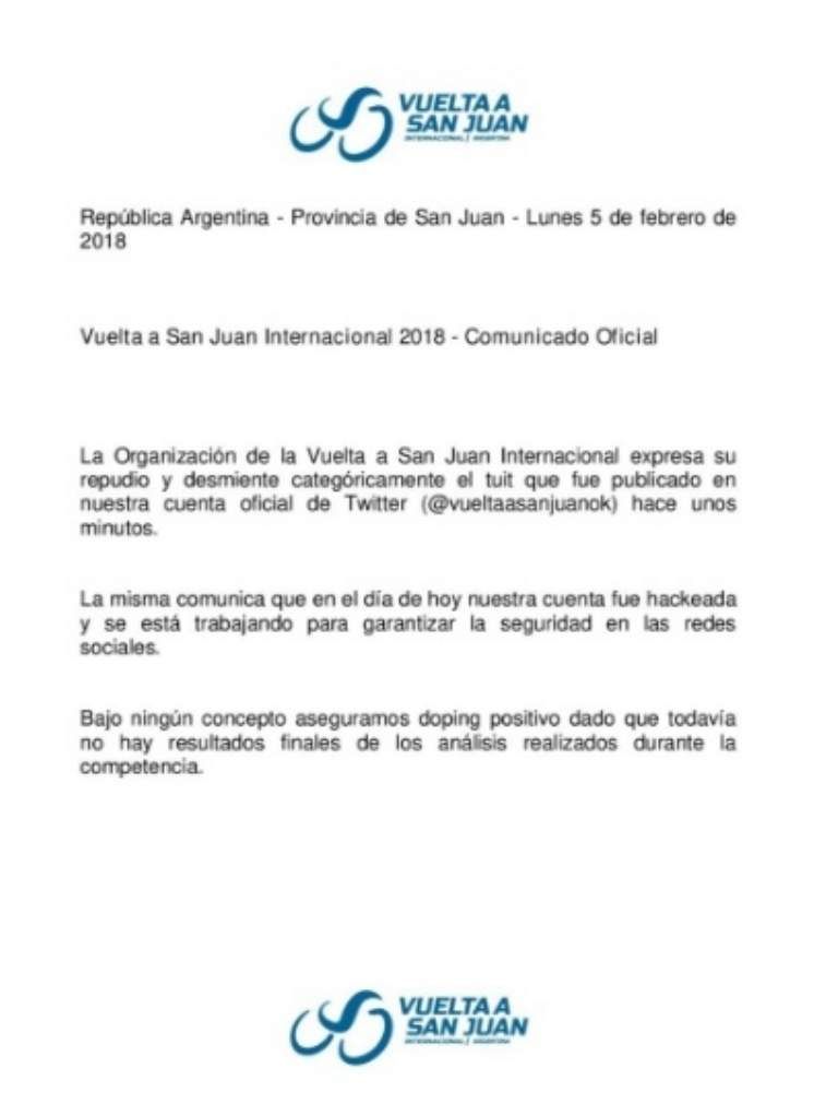 Según un comunicado que publicó la organización "la cuenta fue hackeada" y "bajo ningún concepto aseguramos doping positivo dado que todavía no hay resultados finales de los análisis realizados durante la competencia".