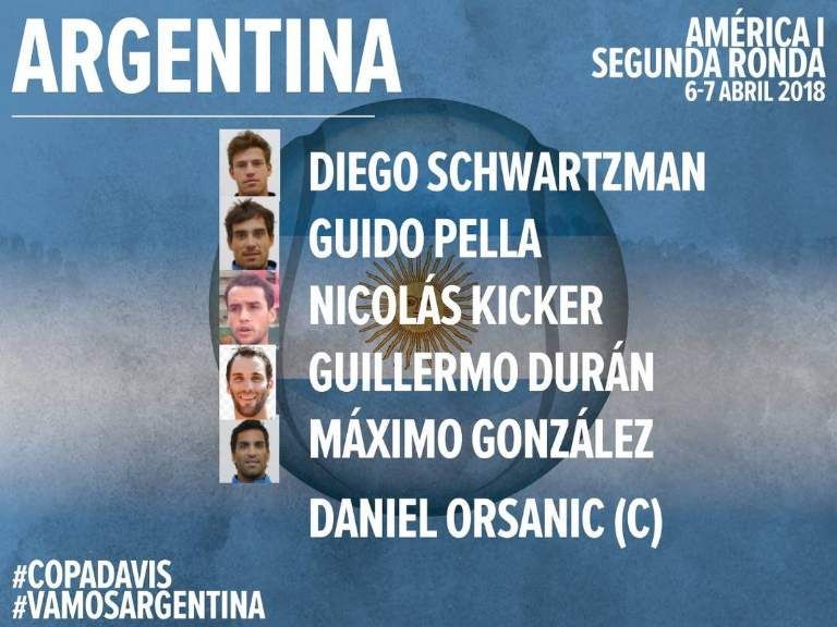 Diego Schwartzman, Guido Pella, Nicolás Kicker, Máximo González y Guillermo Durán fueron los elegidos por Daniel Orsanic para recibir a Chile en San Juan el 6 y 7 de abril, por la segunda ronda del Grupo América de la Copa Davis.