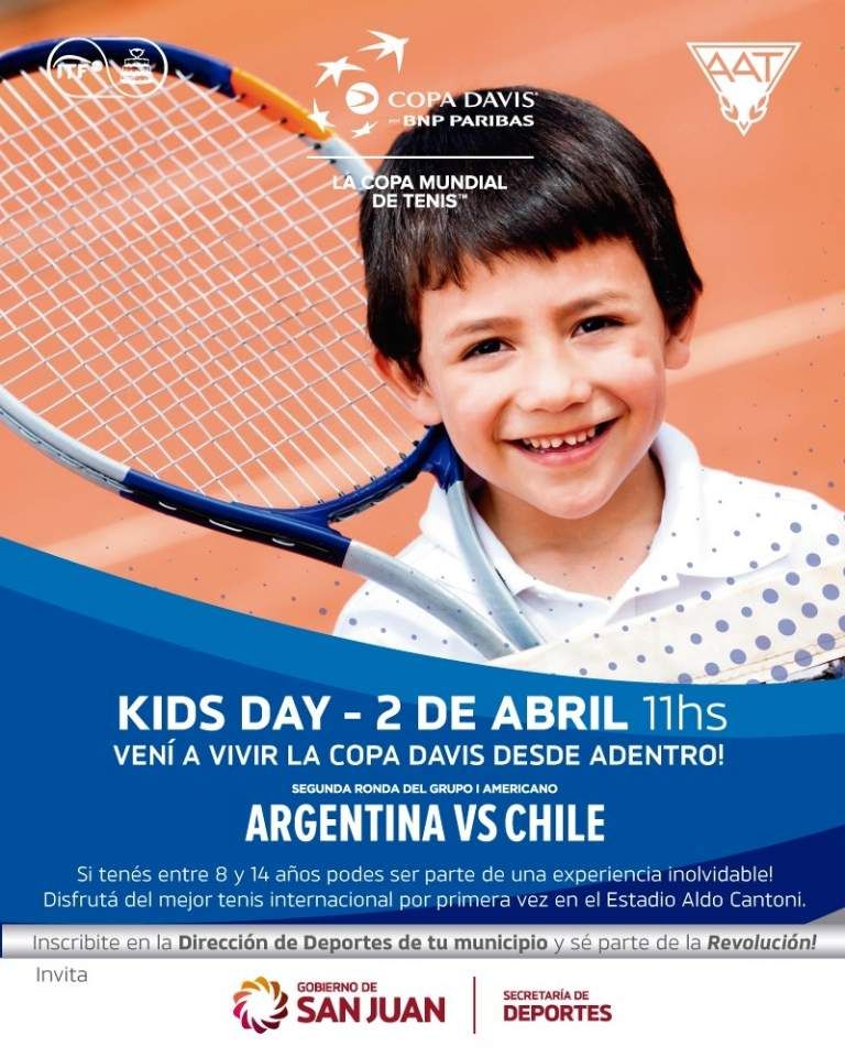 SUSCRIBITEEn el marco del partido entre Argentina y Chile, por la segunda ronda del Grupo 1 americano de la Copa Davis, la secretaría de Deportes invita a los chicos de entre 8 y 14 años a participar de jornadas recreativas en el Estadio Aldo Cantoni.