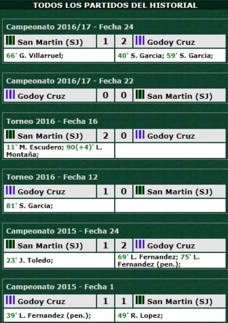 La ventaja en el historial favorece a Godoy Cruz, con cinco victorias sobre dos de los sanjuaninos y tres empates. Pero hay un dato no menor y es que San Martín nunca pudo ganar en Mendoza, siempre teniendo en cuenta a la primera división: el Tomba ganó dos y empataron tres cuando les tocó jugar en el Malvinas Argentinas.