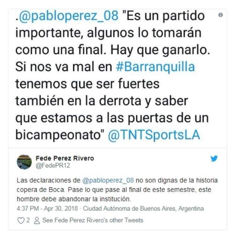 El análisis pasa por si existe algún atisbo de conformismo en las palabras de Pérez. Y bajarle el tono a una posible salida de la Libertadores, cuando la inversión de Boca (y el deseo) estaba más orientado al certamen continental, generó la reacción en las redes.