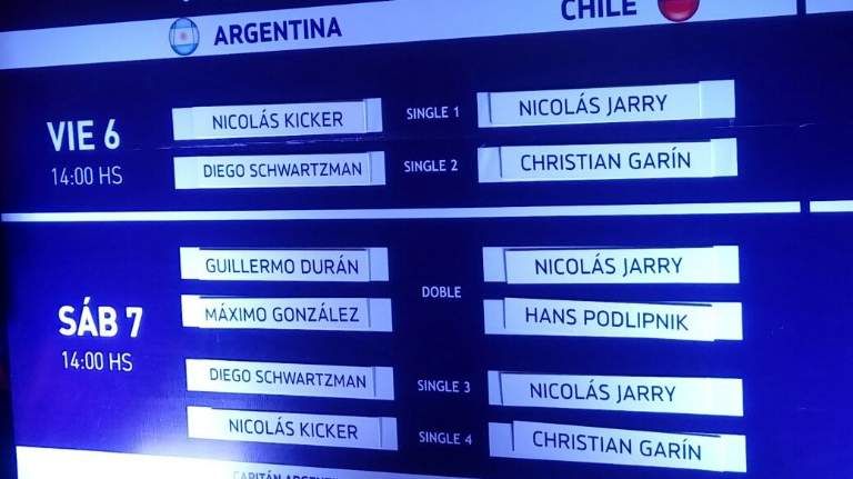 El principal interrogante en la previa del match por la zona Americana de la Copa Davis tuvo su respuesta cuando a las 12.04 el suizo Andreas Egli, árbitro general de Argentina-Chile, dijo que el singlista número 2 de los locales designado por Daniel Orsanic era Nicolás Kicker.