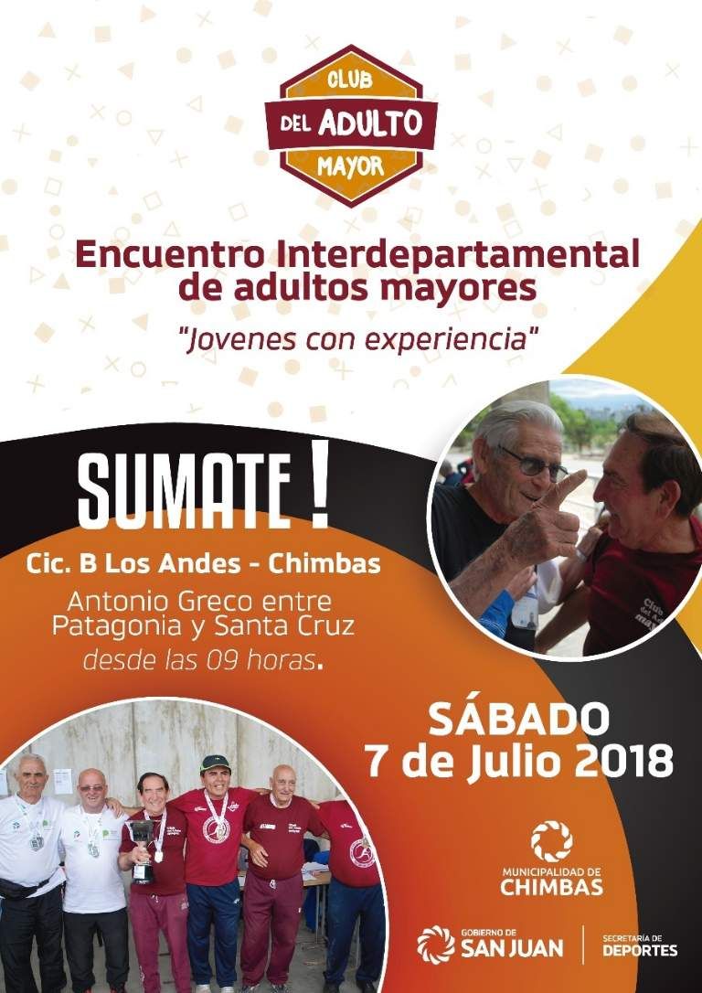 Un encuentro Interdepartamental de Adultos Mayores se llevará a cabo este sábado 7 de junio, 9 a 15.30 horas, enel CIC Bº Los Andes (Antonio Greco entre Patagonia y Santa Cruz). De las actividades participarán unas 150 personas. Habrá juegos y actividad física.