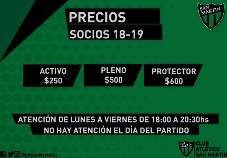 El Club Atlético San Martín anunció a través de su cuenta de Twitter cuáles serán los valores para asociarse en la nueva de temporada de la Superliga Argentina de Fútbol.
