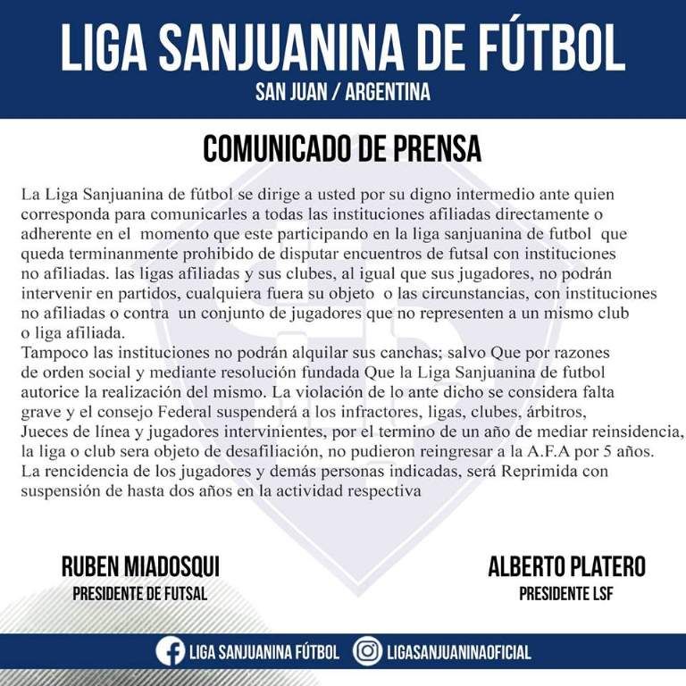 A raíz de que hay jugadores y clubes que disputan el torneo oficial de la Liga Sanjuanina de Fútbol y también otro campeonato en simultaneo, específicamente el que realiza FEFUSA, es que el Departamento de Futsal se puso firme y comunicó que no está permitido disputar dos torneos paralelos. Así lo manifestó también su máximo titular, Rubén Miadosqui.