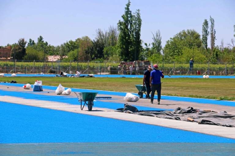 La obra avanza a pasos agigantados. Se espera que a principios de la semana que viene finalicen los trabajos en la superficie sintética de color azul (caucho de etileno propileno dieno) para luego comenzar con las tareas de demarcación.