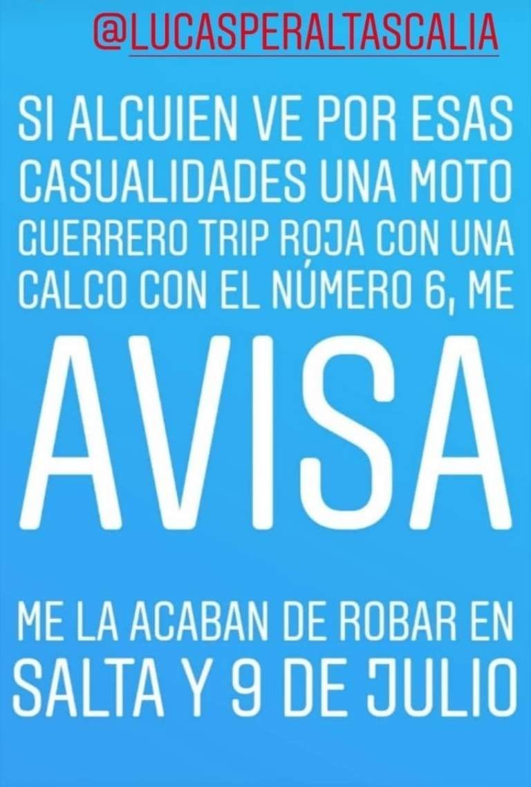 SUSCRIBITELucas Peralta, jugador de hockey del club Unión, sufrió el robo de su moto este miércoles en horas de la siesta. Según dijo, dejó su Guerrero Trip 110 en la puerta de unas oficinas, en Capital.