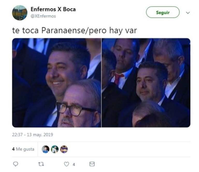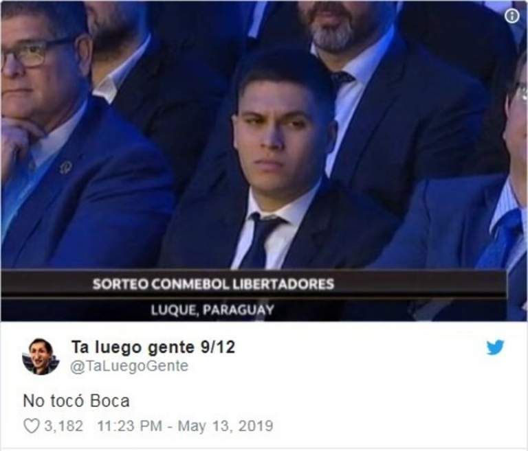 Como ocurre en cada oportunidad que hay un evento importante relacionado con el fútbol, en cuanto terminó el sorteo de la Copa Libertadores, los usuarios de las redes sociales hicieron uso de toda su creatividad y se divirtieron con los cruces por los octavos de final de la Copa Libertadores. El gesto de alivio de Daniel Angelici por no enfrentar a River, las similitudes entre San Lorenzo y Cerro Porteño y Godoy Cruz, quien deberá jugar con Palmeiras, fueron los principales protagonistas de los memes.