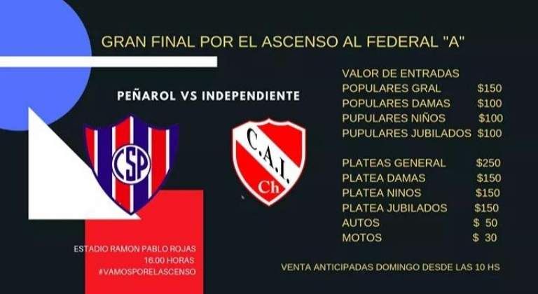 Peñarol enfrenta este domingo a partir de las 16:00 horas a Independiente de Chivilcoy por la lucha de un ascenso al Federal A. Ahora la comisión directiva del club chimbero dio a conocer los precios para este partido en el estadio Ramón Pablo Rojas. La venta empezará el domingo a partir de las 10 horas.
