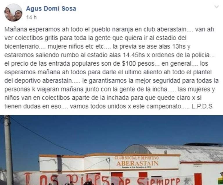 La gran final entre Aberastain y Atenas, clásicos rivales pocitanos, se disputará este domingo, a las 16.00 hs, en el Estadio del Bicentenario. Para tal histórica ocasión, el club naranja espera contar con el mayor apoyo posible de su público y por eso ha puesto a su disposición colectivos gratuitos hasta la cancha ubicado sobre la Ruta 40.
