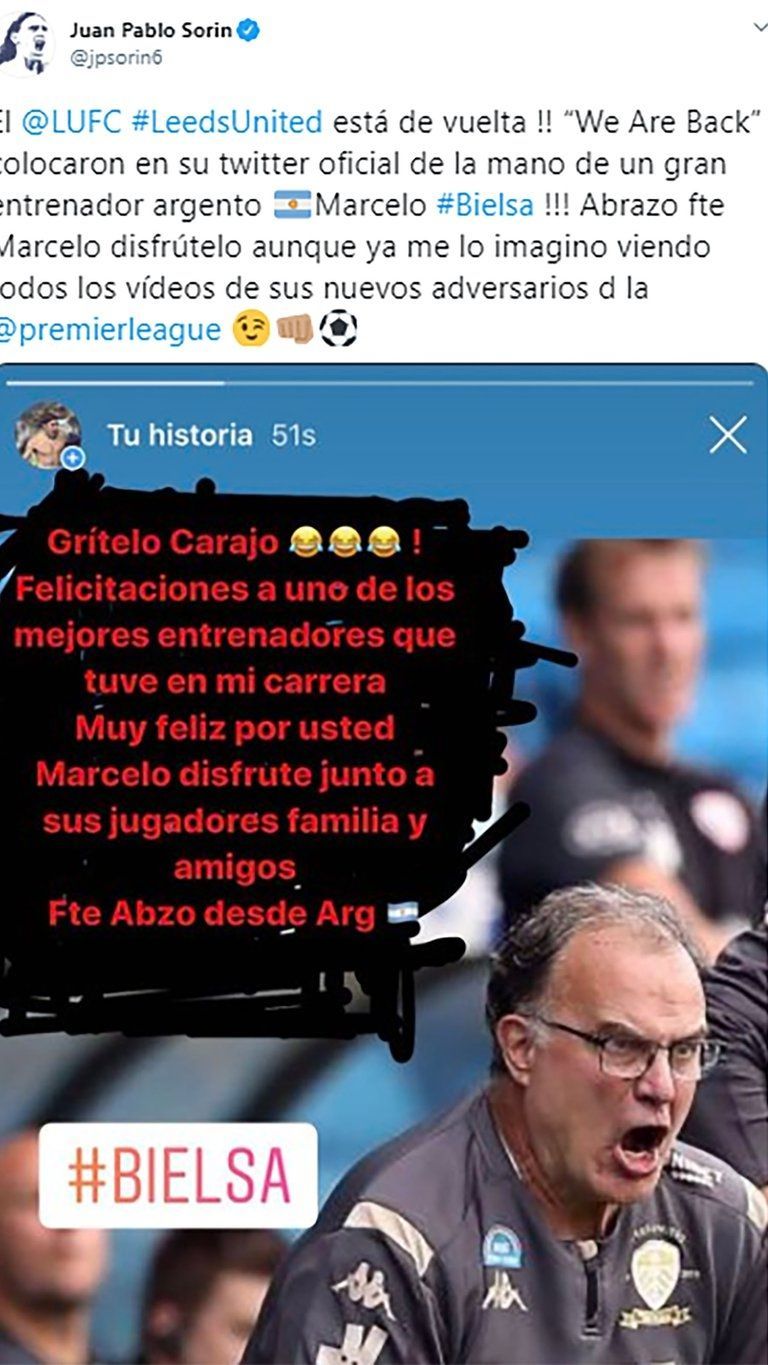 Juan Pablo Sorín no dejó pasar la oportunidad y hasta se animó a bromear con la “obsesividad” del técnico. “El Leeds United está de vuelta !! “We Are Back” colocaron en su twitter oficial de la mano de un gran entrenador argento Marcelo Bielsa!!! Abrazo fuerte Marcelo, disfrútelo aunque ya me lo imagino viendo todos los vídeos de sus nuevos adversarios de la Premier League”.