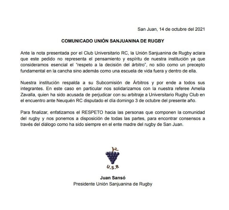 Luego del polémico pedido que realizó el club Universitario Rugby solicitando que la referí Amelia Zavalla no sea nunca más la encargada de impartir justicia en los encuentros en los que participe su equipo de primera división ni en las escalas inferiores, la Unión Sanjuanina de Rugby salió a bancar a la árbrito.