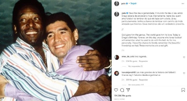 "Dios te dio el genio. El mundo te dio su amor. Para siempre, en este día, cualquiera que ame el fútbol recordará lo que solías hacer con el balón. En cuanto a mí, personalmente, tengo la oportunidad de recordar con cariño la hermosa amistad que tuvimos", fue lo que escribió 'O Rei' junto a una foto de ambos abrazados