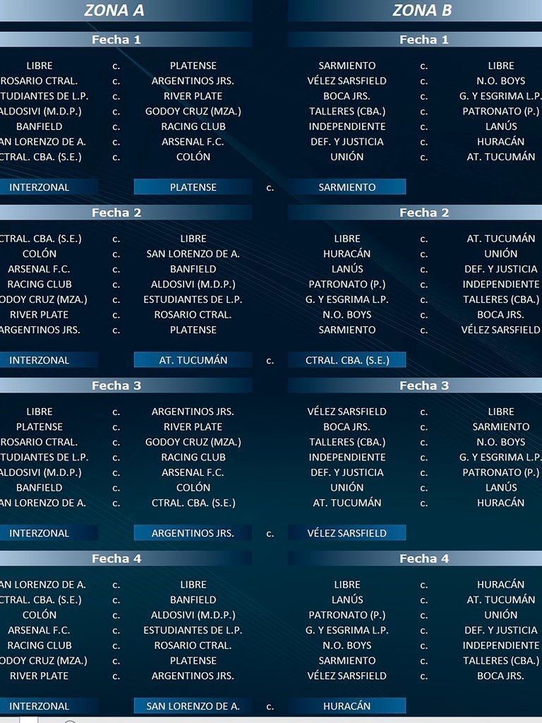 En la primera fecha, por la Zona A, se medirán Rosario Central-Argentinos, Estudiantes-River, Aldosivi-Godoy Cruz, Banfield-Racing, San Lorenzo-Arsenal y Central Córdoba-Colón. Por la B, Vélez-Newell’s, Boca-Gimnasia, Talleres-Patronato, Independiente-Lanús, Defensa y Justicia-Huracán y Unión-Atlético Tucumán.