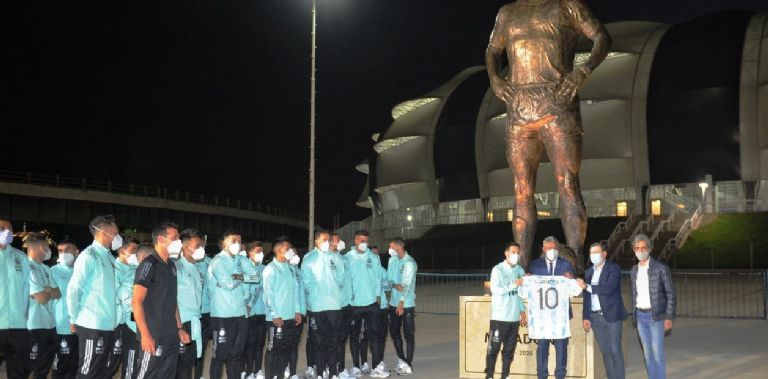 Diego, Leo y un homenaje de 10. La estatua más alta del mundo en honor a Maradona ya vio el cielo en las puertas del Estadio Único Madre de Ciudades de Santiago del Estero. Messi descubrió esa magnífica obra que talló el escultor cordobés Carlos Benavídez. Un tributo para la historia. En la previa al encuentro ante Chile, el capitán encabezó el acto de inauguración al lado de todos los futbolistas de la Argentina, que aplaudieron la enorme figura maradoniana.