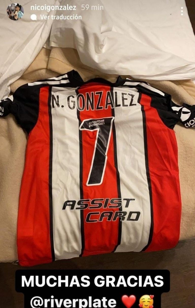 González le agradeció al equipo de Núñez por una camiseta que le obsequiaron: la casaca suplente -Tricolor- que usa el elenco de Gallardo, con su apellido y el número siete. "Muchas gracias", expresó, con dos emoji: uno de felicidad y el otro un corazón rojo. ¿Amor por la Banda?