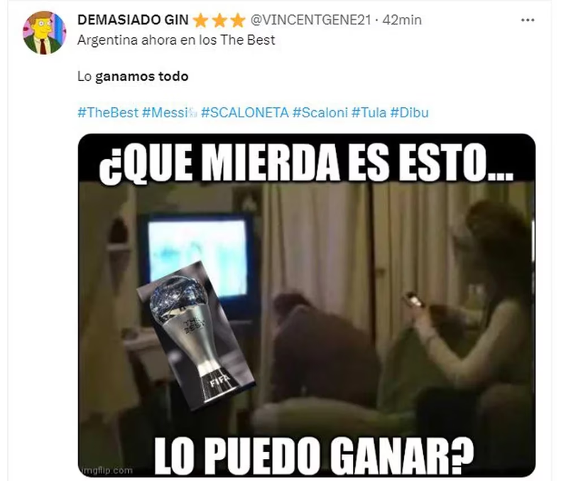 Todos pendiente y dejando de lado las responsabilidades un rato para pispear las redes sociales. Es que este lunes por la siesta se entregaron en Francia los Premios The Best que tuvo a los argentinos ternados: Lionel Messi, Lionel Scaloni, Emiliano 'Dibu' Martínez y 'El Tula', el hincha albiceleste que se llevó el galardón a la mejor afición del Mundial de Qatar.
