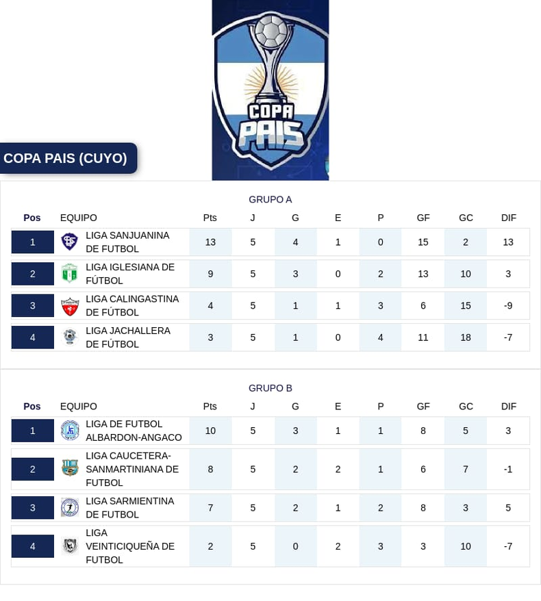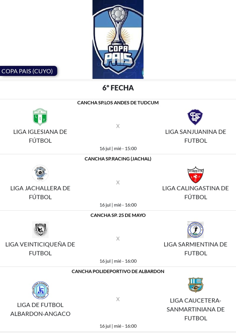 La Copa País sigue brindando emociones a lo largo de las fechas y desde la Federación dieron a conocer cómo se disputará el sexto capítulo que tendrá a varias canchas sanjuaninas afectadas a la actividad. La Liga Sanjuanina lidera el grupo A con 13 puntos y es uno de los máximos candidatos a acceder a la siguiente instancia.
