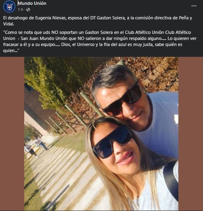 Tensión y tristeza es lo que se vive dentro del mundo Unión de Villa Krause en las últimas horas. Luego del partido ante San Lorenzo, el plantel que dirige Gastón Solera fue agredido y él, terminó en el hospital por un golpe en la cabeza. Cerca de las 22hs del miércoles, el equipo Azul estuvo regresando a Rawson luego de la emboscada y de resguardase en la Seccional departamental. Tras cumplirse 24 horas de otra mancha al fútbol sanjuanino, la esposa del técnico apuntó a la Comisión Directiva por 'falta de respaldo'.