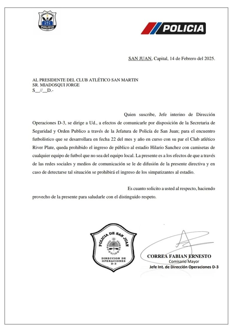 La Policía de San Juan emitió en las últimas horas un comunicado en el que asegura que para el encuentro San Martín - River Plate, del próximo sábado 22 de febrero, estará totalmente prohibido el ingreso al Estadio Hilario Sánchez con distintivos o Indumentaria de otro equipo que no sea el Verdinegro.