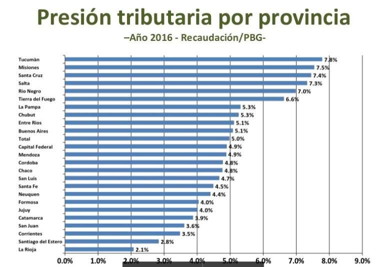 Según este documento, la presión impositiva de las provincias aumentó un 78 % más que la economía, entre 2002 y 2016. La cifra surge la correlación del incremento de la recaudación respecto del PBI.