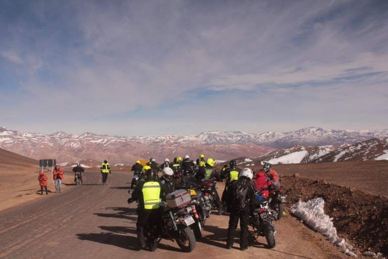 Una postal inusual se vio este sábado a casi 5.000 metros de altura en el portezuelo de Conconta, camino a la mina Veladero: 32 motos de travesías largas, como BMW y Honda Transalp, paradas en la calzada mientras sus conductores se tomaban fotografías rodeados de la imponente cordillera de Los Andes.