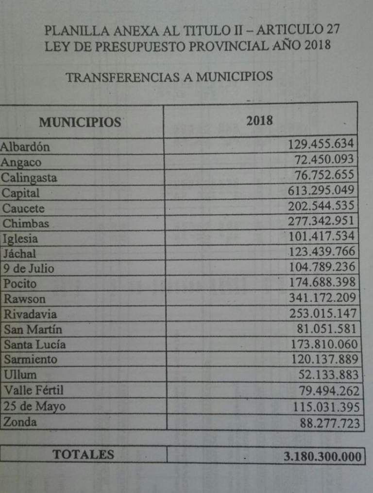 El proyecto de ley del presupuesto provincial para el año que viene destina un total de 3.180.300.000 pesos para todas las comunas, en el marco de la coparticipación. Esto implica un crecimiento del 25,2% en general respecto de lo presupuestado para este año, que fue 2.538.687.000 pesos, lo que se traduce en 641,6 millones más. Para el reparto se usaron los mismos criterios que en el presente ejercicio, y la meta es que la próxima transferencia anual se rija con una ley de coparticipación histórica, que actualmente se está gestando en una mesa de consenso entre el Ministerio de Hacienda y los equipos económicos de cada municipio.