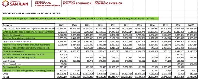 Más de 500 productos argentinos, entre los que se encuentran 10 de San Juan (vinos, aceite de oliva, semillas, ajos, aceitunas en conserva, espárragos, otras ferroaleaciones, ferrosilicio, carburo de calcio y cebollas), entrarán a Estados Unidos con arancel cero a partir de enero de 2018 y desde el Ministerio de Producción y Desarrollo Económico ya planean asistir a una feria de vinos para comenzar a hacer negocios.