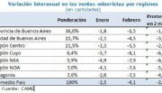 Si se toma solo el segundo mes del año, febrero, las caídas fueron más pronunciadas aún. Por ejemplo, mientras a nivel país las ventas bajaron 4,1% anual, en Cuyo la el declive fue de 8,1%, en la región NEA de 7,9%, en NOA bajaron 7,6%, en la Patagonia 7,5%, mientras que en la Ciudad de Buenos Aires el descenso fue de 4,5%. En la provincia de Buenos Aires, en tanto, con más heterogeneidad, la baja anual promedio del mes fue de 1,5%.