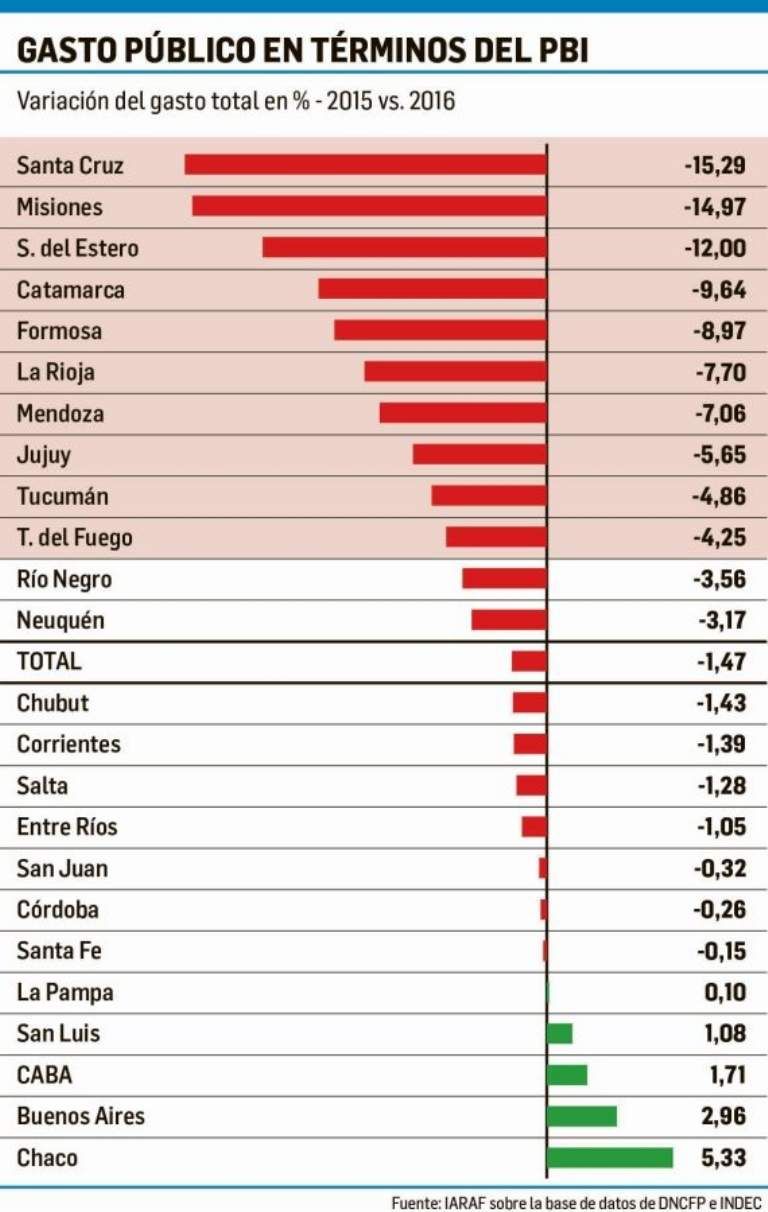 En contraposición, en el podio de los distritos que menos ajustaron el gasto se encuentran, paradójicamente, la provincia de Buenos Aires y la Ciudad de Buenos Aires (no se contemplan los recursos destinados al traspaso de la Policía Federal a Horacio Rodríguez Larreta), ambas Cambiemos, escoltas de Chaco, del peronista Domingo Peppo.