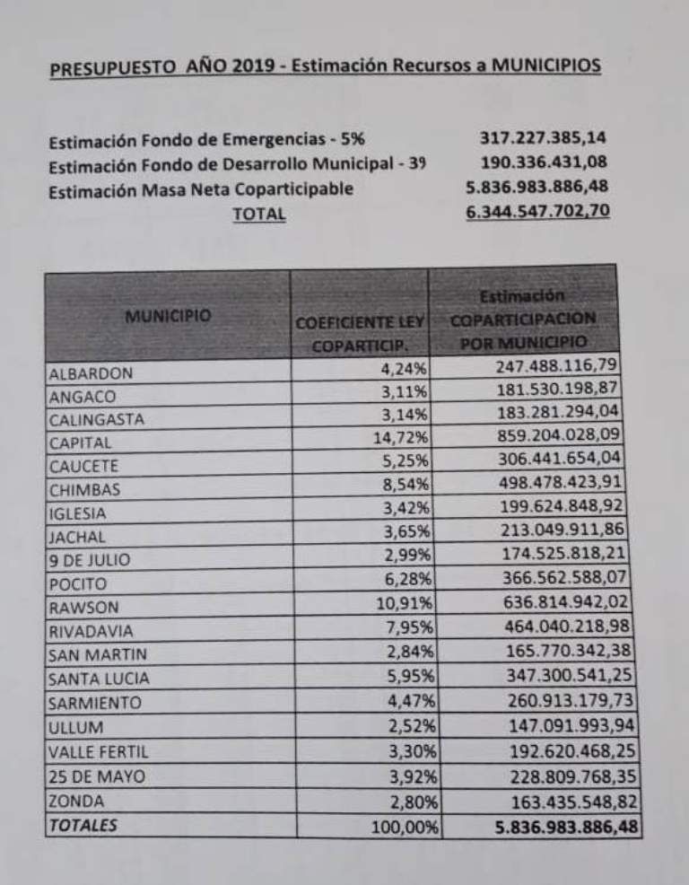 SUSCRIBITEUna cifra estimada en $6.344 millones es la que recibirán los municipios sanjuaninos el año próximo según el proyecto de ley Presupuesto 2019, cifra ajustada al nuevo reparto surgida de la nueva ley de coparticipación de la provincia.
